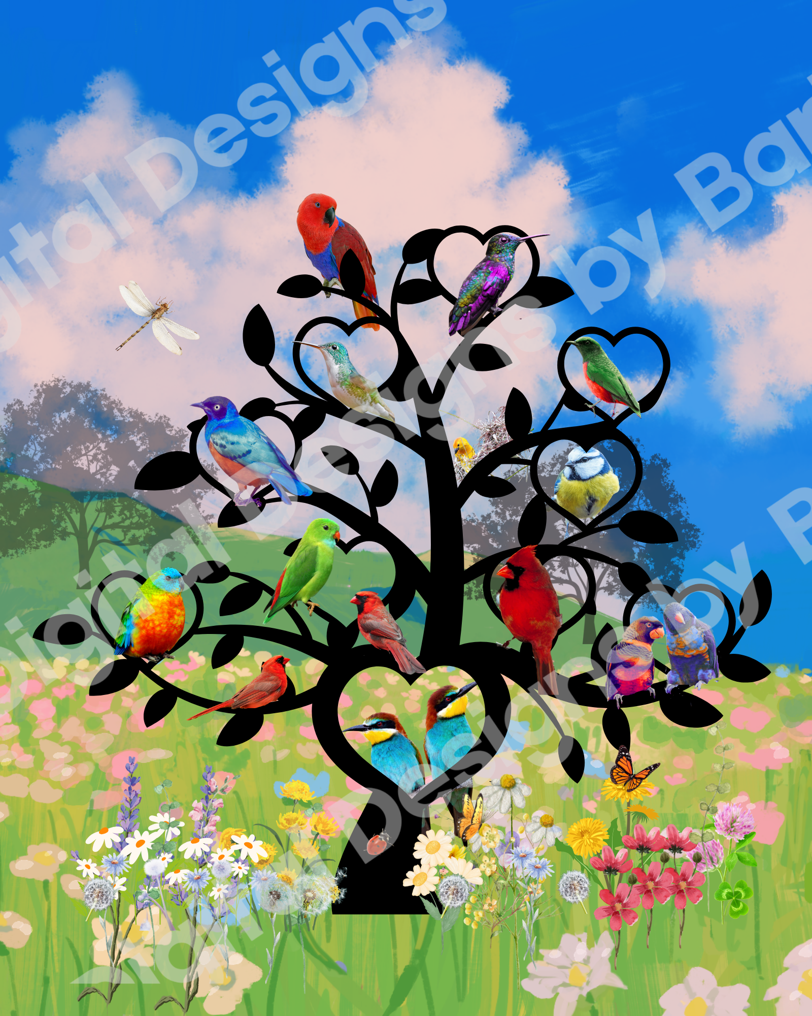 A gathering of color and song, this piece captures the quiet joy of nature in balance — where every small creature has its place, and stillness feels alive. The color and beauty of the birds make us pause in wonder at God’s creations, a gentle reminder of the peace and perfection found in the natural world.