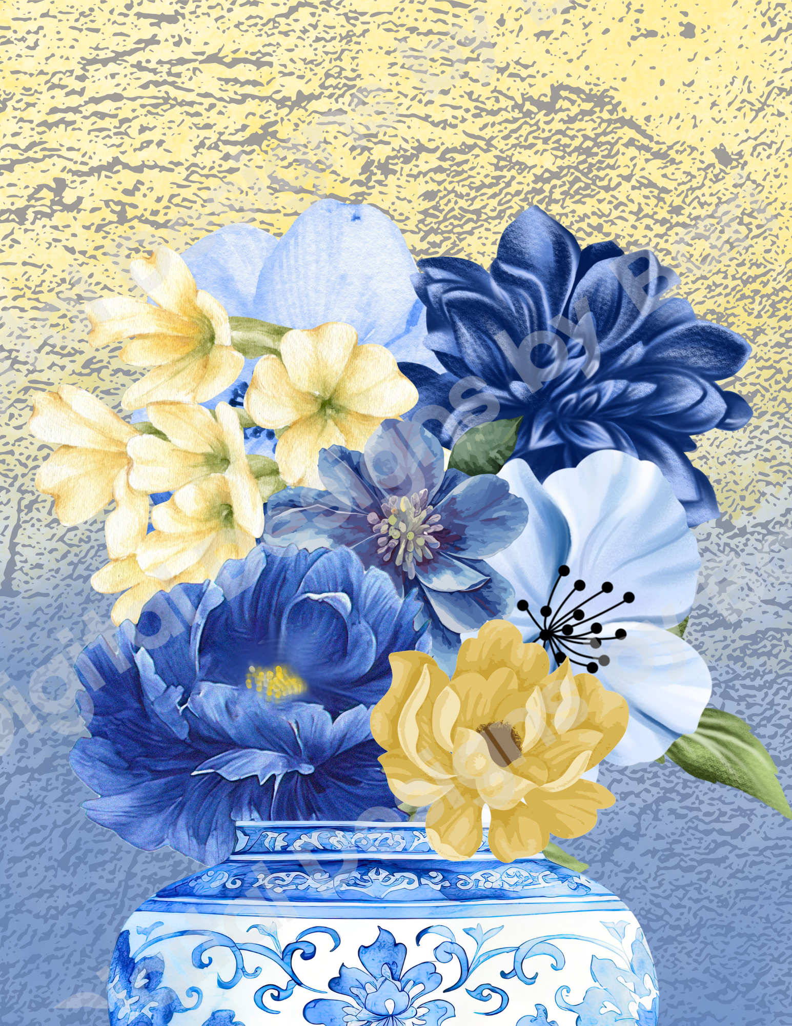 A radiant blend of indigo, sky blue, and soft golden florals rises from an ornate hand-painted vase, glowing like the first light of morning. The textured gold-to-blue background wraps the arrangement in warmth, giving the entire piece a luminous, sunrise-inspired feel. Each petal shows depth and soft movement, creating an elegant statement artwork that adds beauty and calm to any space.