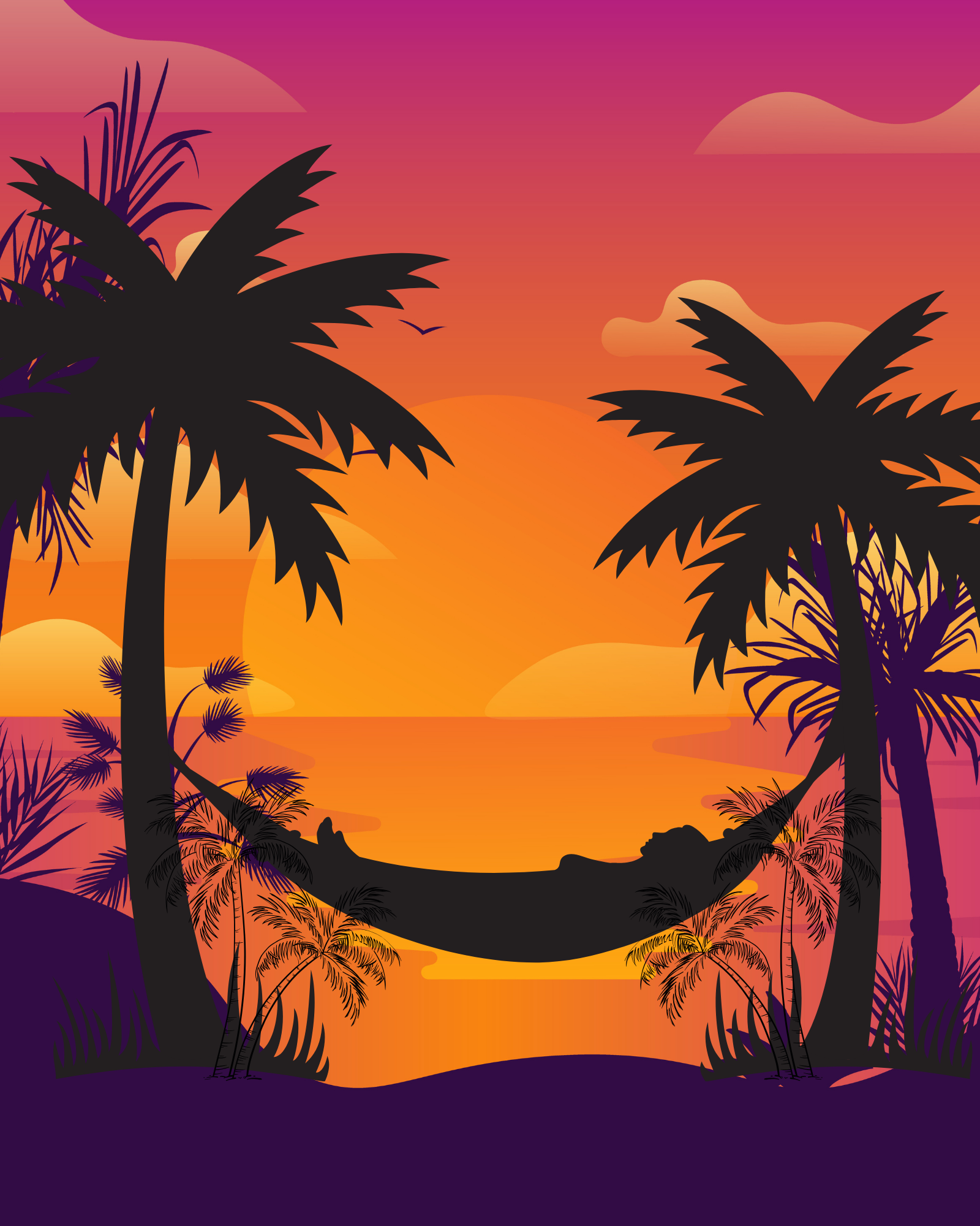 As the sun dips low, a hammock sways between silhouettes of palms — a tranquil portrait of rest, warmth, and the serenity that comes with letting the day go.