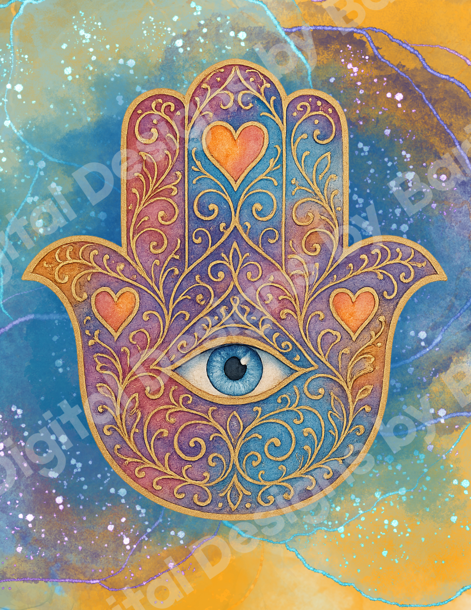 Golden filigree flows through hues of violet, sapphire, and coral, forming a radiant dance of love and protection. The central eye shimmers like glass beneath starlight — a reminder of spiritual awareness, intuition, and the light that connects us all. The heart motifs bring warmth and compassion, grounded by a celestial backdrop that feels both ancient and timeless.