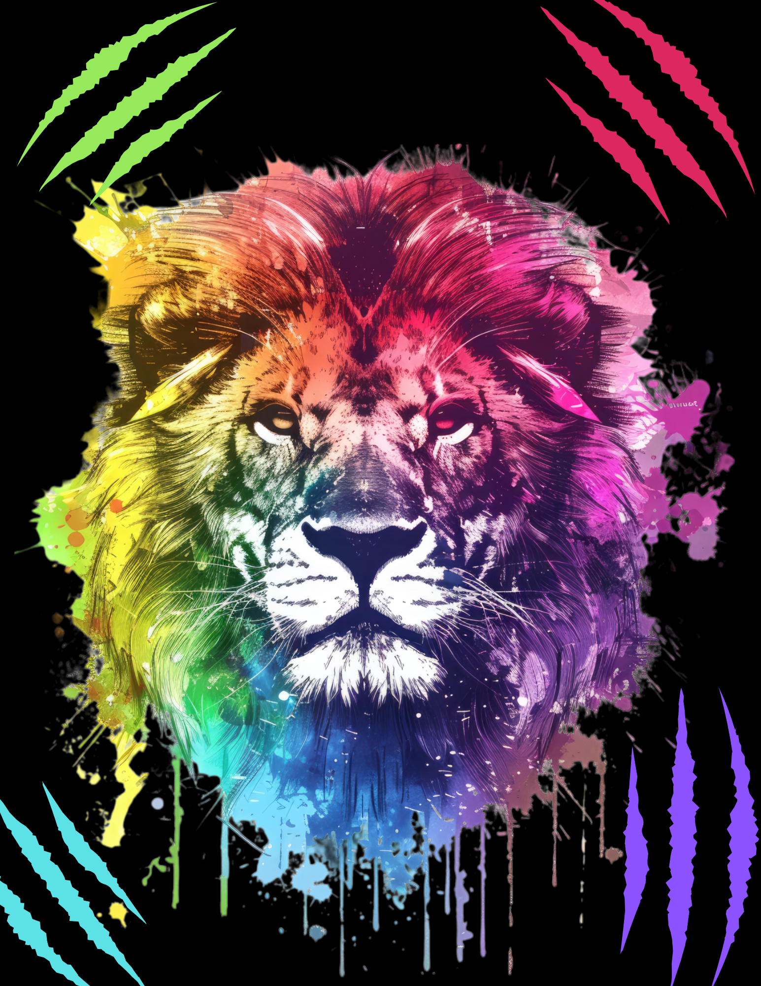 A bold lion portrait intersected by claw-mark details. The design contrasts deep golds and shadow tones to emphasize power and focus. Second version is contrasted by a rainbow of colors. Both beautiful...which one speaks to you?