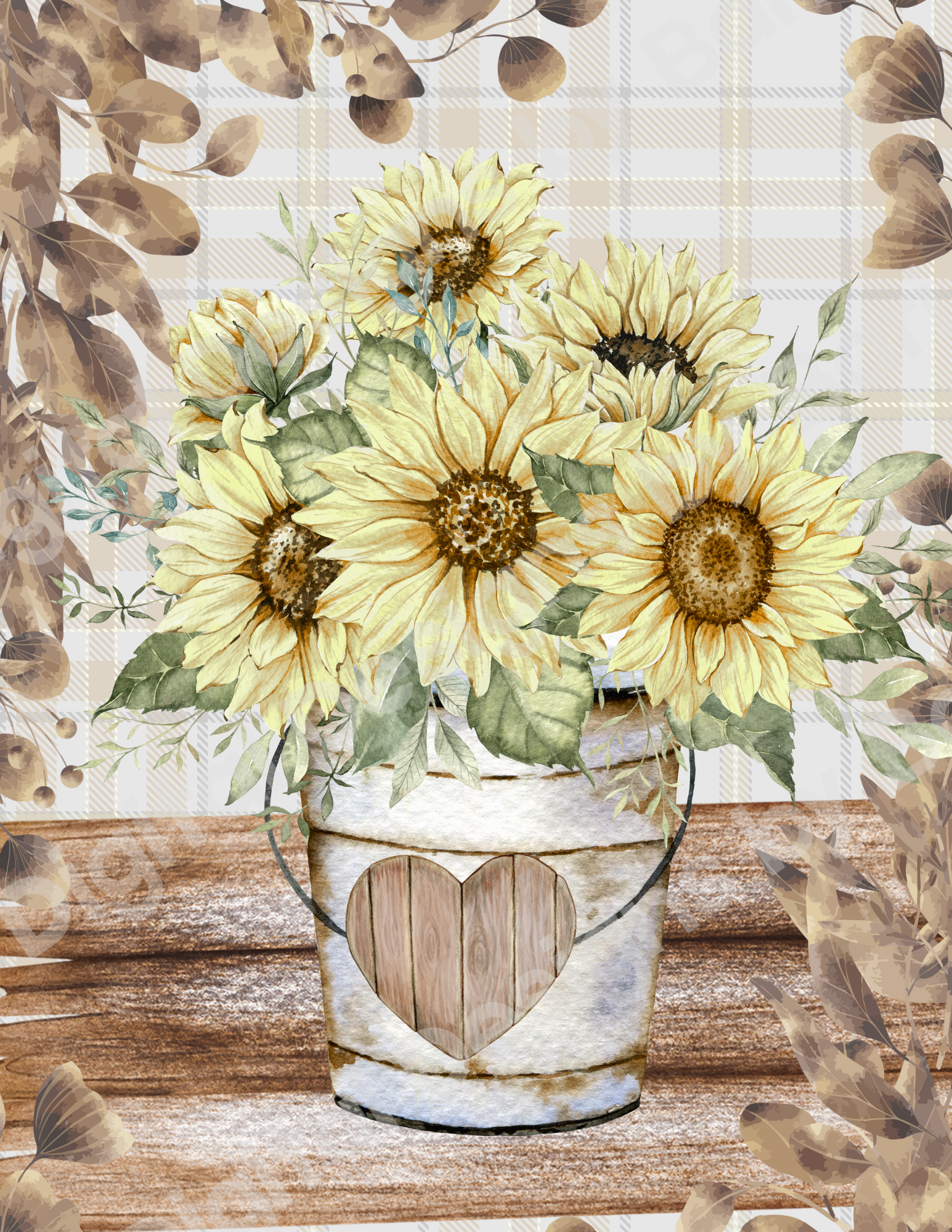 Golden petals stretch toward imagined sunlight in “Sunflower Song,” a rustic arrangement set against warm plaid tones and soft autumn leaves. The wooden-hearted pail adds a farmhouse touch, while the sunflowers’ natural radiance conveys gratitude, warmth, and optimism — an ode to simple joys and steady light.