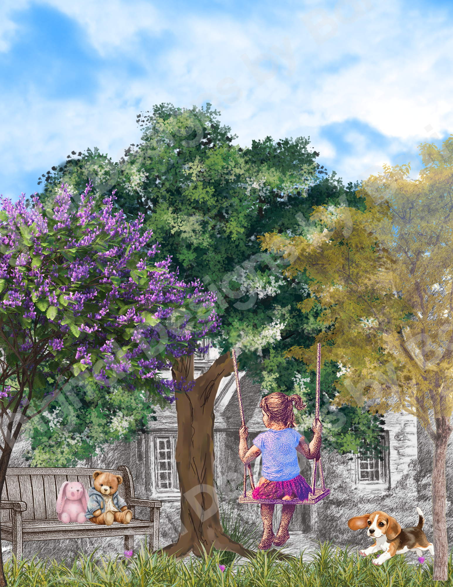 A quiet afternoon suspended in time — a little girl on her swing, the gentle sway of branches, her puppy bounding nearby, and two stuffed friends waiting patiently on a wooden bench.