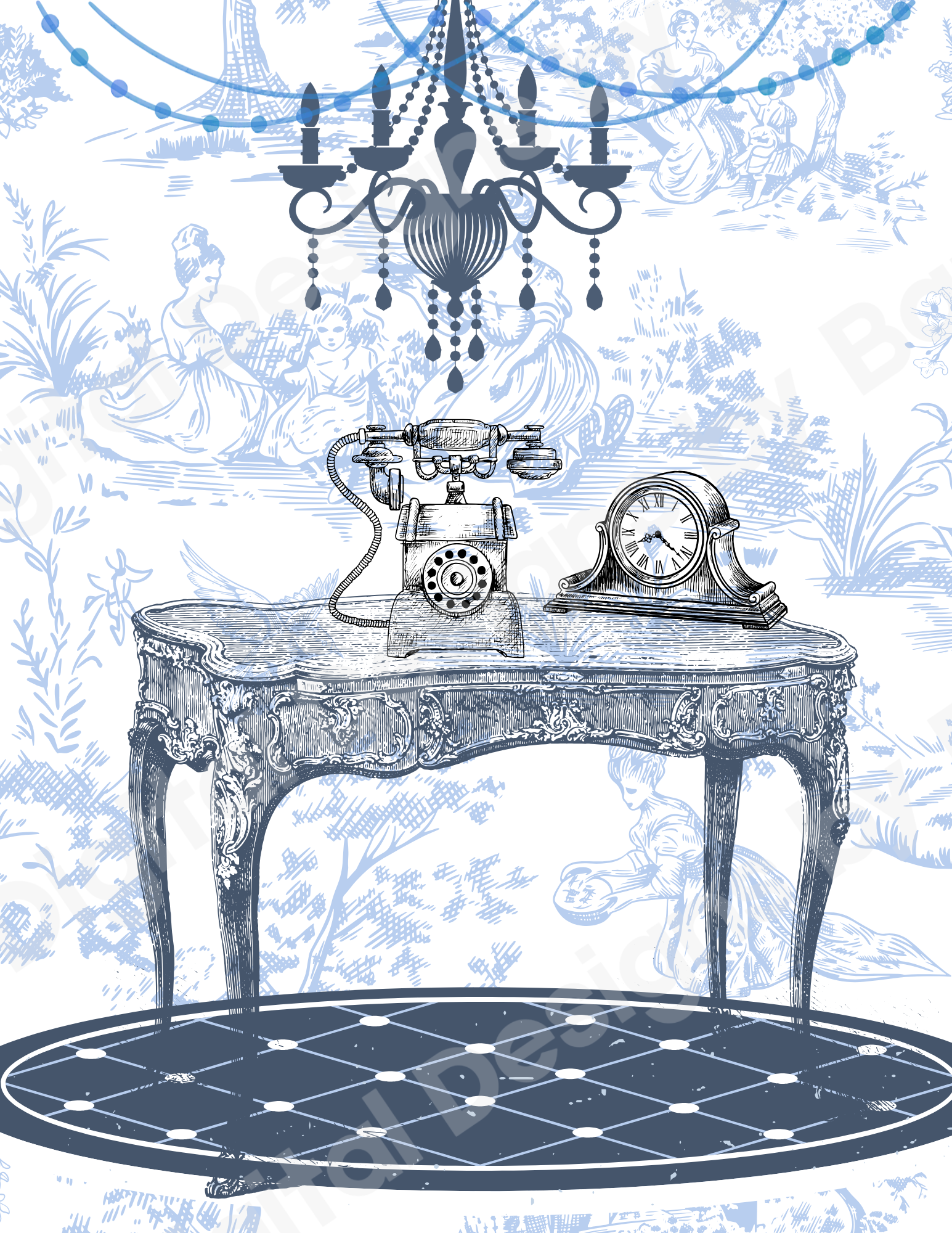 Victorian Elegance brings classic beauty to life with refined detail and graceful charm. An ornate chandelier casts its light over a vintage dressing table — a delicate study in symmetry, texture, and poise. The soft blue tones and lace-like patterns evoke an era where artistry met sophistication, turning ordinary spaces into timeless sanctuaries.